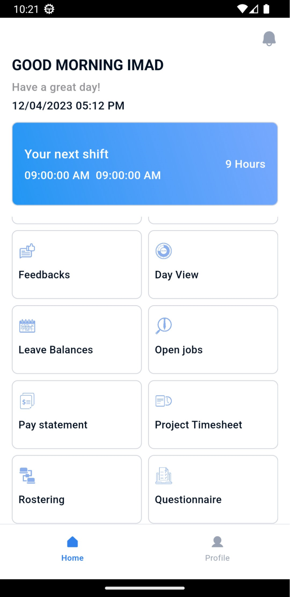 You can see your profile once you sign in to the app through your Microsoft account. It takes you to the profile screen to view your profile if details have already been added. If you are a new user, you will see your shift details once the manager updates your schedule and tasks.